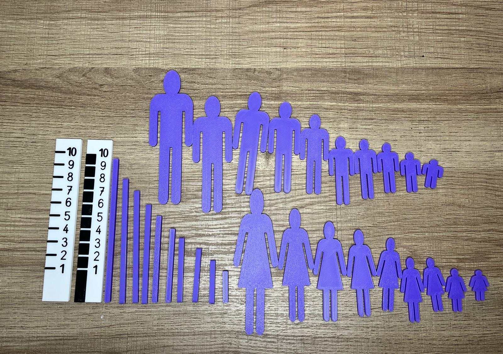 Le kit pédagogique tailles homme femme aide les enfants à comprendre les notions de comparaison, de classement et d’ordre. Il est fabriqué en PLA biosourcé français Capifil, un matériau local et respectueux de l’environnement.